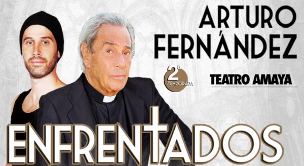 «Enfrentados» es la obra que Arturo Fernández, a sus 86 años, reestrena por segunda temporada en el Teatro Amaya. El chatín interpreta a un carismático sacerdote que discute y debate con su rebelde seminarista sobre todas aquellas patatas calientes que la iglesia tiene entre sus manos. De total actualidad