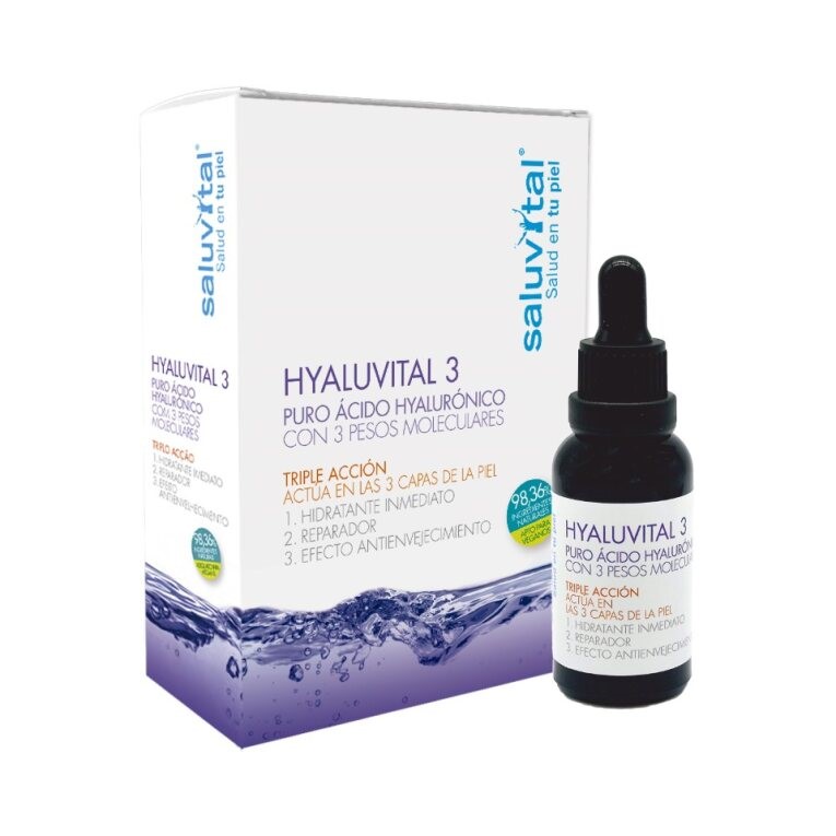 Sérum HYALUVITAL 3 Ácido Hialurónico, que combina los tres pesos moleculares para una triple acción desde la primera aplicación. Se recomienda usar mañana y noche sobre rostro, cuello y escote.