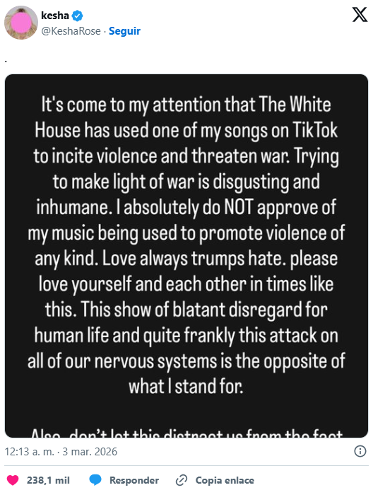 El vídeo compartido en TikTok incluía el tema Blow como música de fondo mientras se mostraban imágenes militares. Ante esto, la artista denunció que su música se utilizó para “incitar a la violencia y amenazar con la guerra”, algo que aseguró no aprobar en ningún caso. En un mensaje difundido en sus redes sociales, Kesha afirmó que trivializar un conflicto bélico mediante bromas o contenidos virales resulta “asqueroso e inhumano”.
